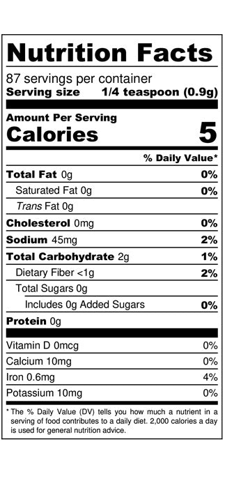 Jalapeño Powder, Hatch Pepper Powder, Garlic Powder, Onion Powder, Sea Salt, Thyme, Marjoram, Ancho Chili Powder, Black Pepper, Cumin, Coriander, Cayenne Pepper, Saigon Cinnamon