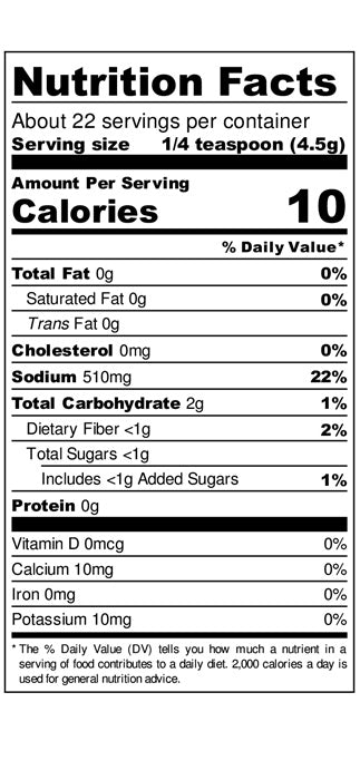 Sea Salt, Lime Powder, Rainbow Peppercorns, Lemon Pepper, Lemon Rind, Organic Maple Sugar.