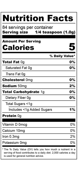 Mustard Powder, Apple Powder, Summer Savory, Black Pepper, Pink Himalayan Salt, Organic Mesquite Powder, Thyme, Garlic, Onion, Mustard Seed, Chipotle, RFSC Chili Powder (Anaheim Pepper, Chile Ancho, Guajillo Pepper, Oregano, Aji Panca Chili Peppers, Chile De Arbol, Garlic Powder, Cumin Seed).